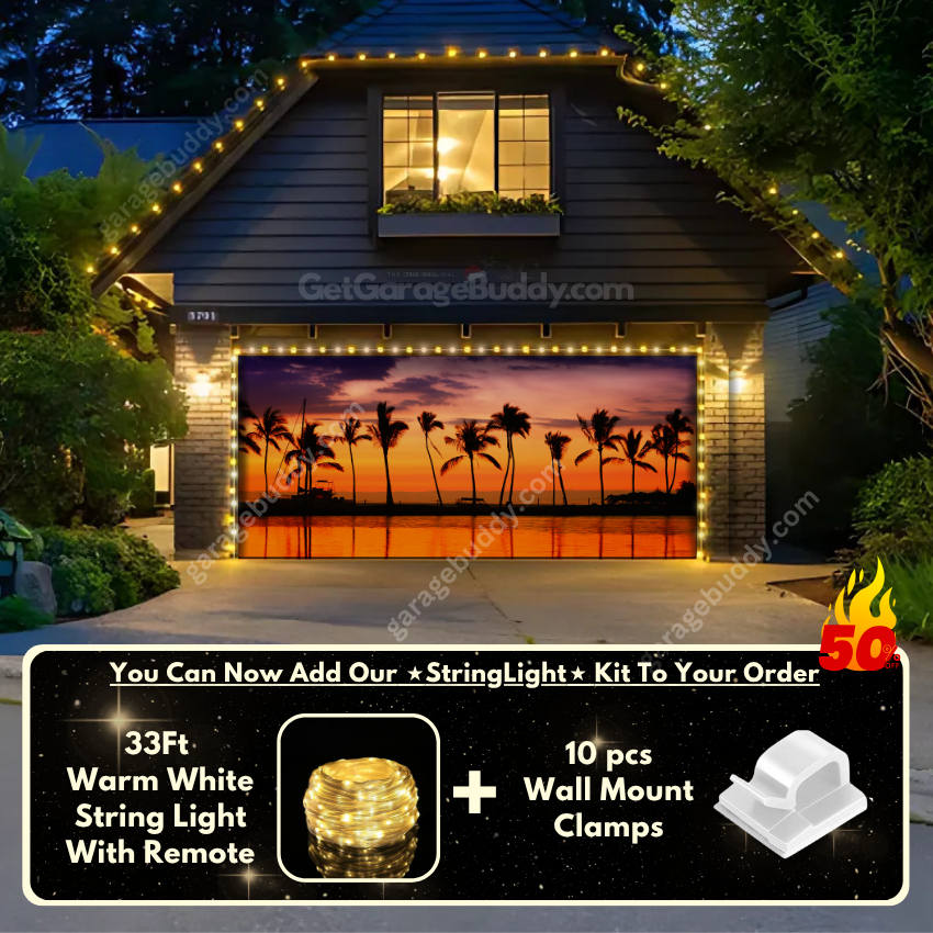 Elevate your garage door cover with the GarageBuddy string light kit—available at 50% off. Turn your garage into a glowing paradise, perfect for enhancing the serene beach scene. The kit includes 1x 33 ft warm white string light, a remote control, and 10x sticky wall mount clamps. The 2-door garage option comes with 2 string light kits. The lights work on three AA batteries (not included), so you don't need to run around finding electrical outlets.