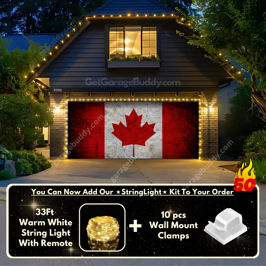 Take your patriotic setup to the next level with our GarageBuddy string light kit, now available at 50% off. Pair your Canada Flag (Rustic) Patriotic Garage Door Banner with glowing lights for a bold and festive effect. The kit includes 1x 33ft warm white string light, a remote control, and 10x sticky wall mount clamps. The 2-Door garage option comes with 2 string light kits. The lights work on three AA batteries (not included), so you don't need to run around finding electrical outlets.