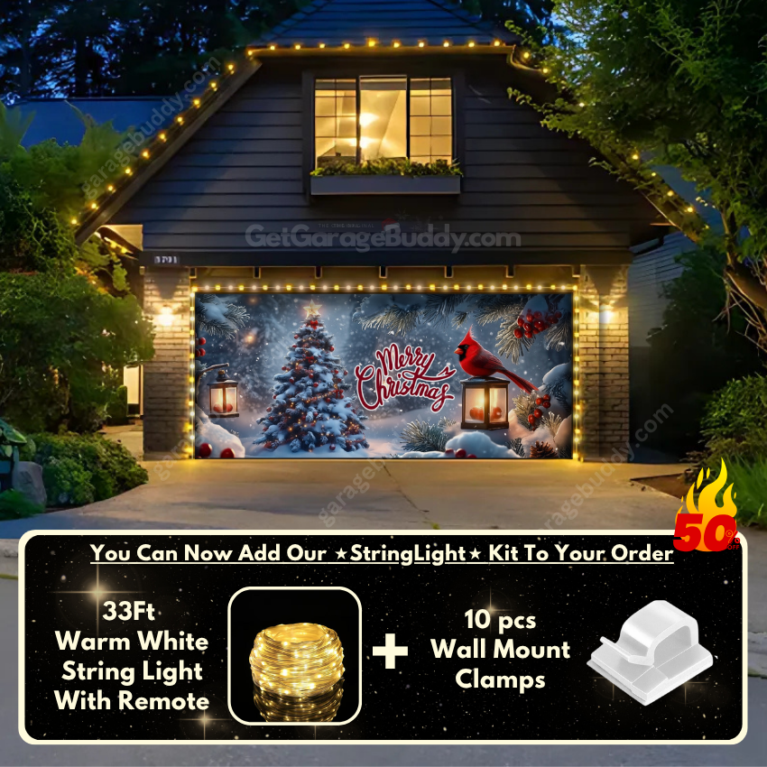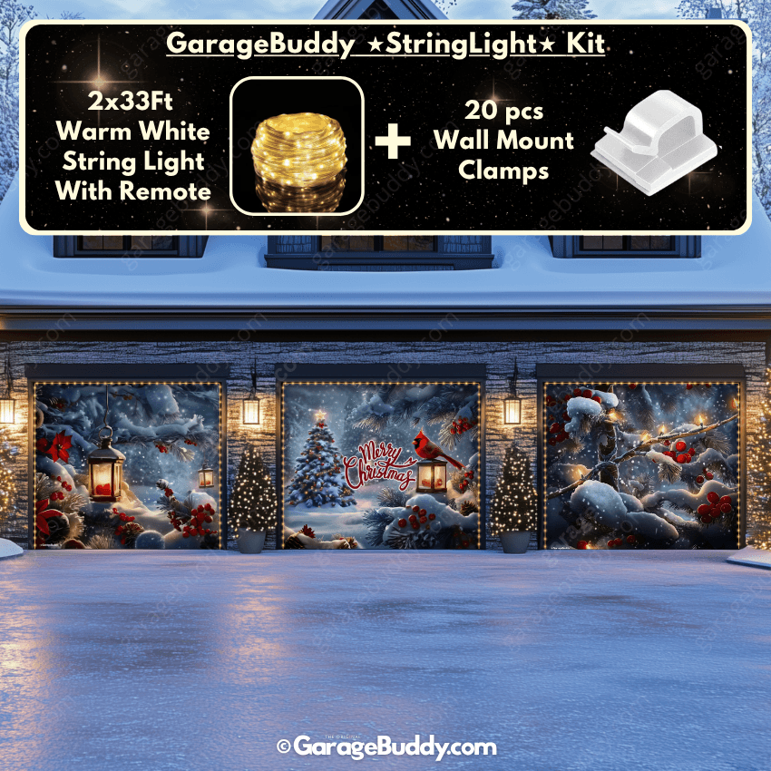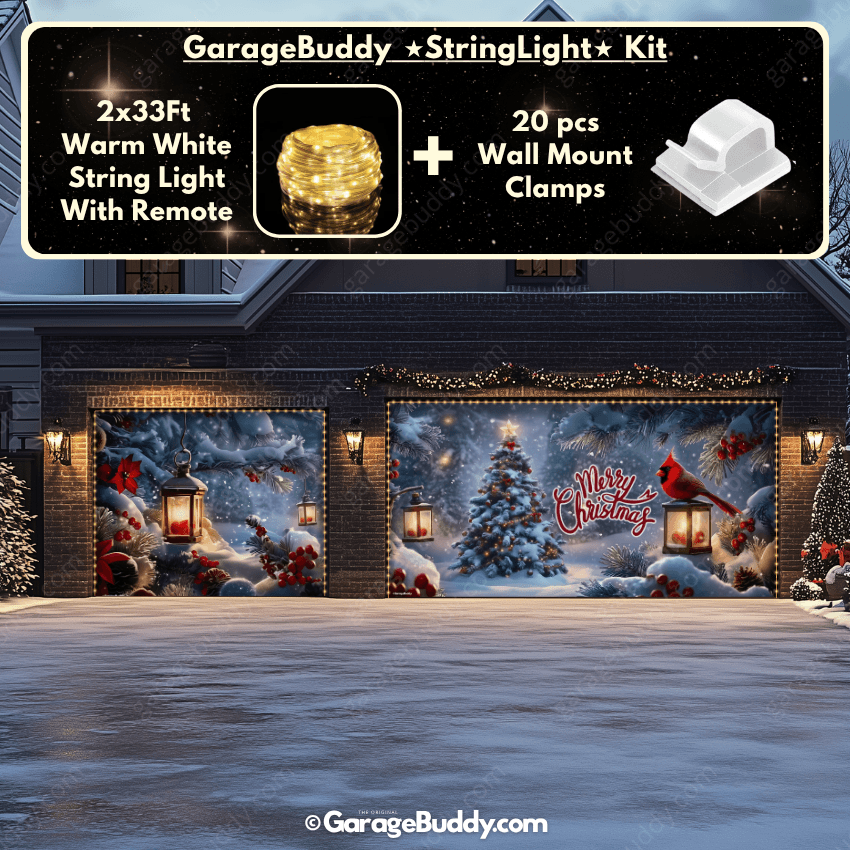 You now have the option to add the GarageBuddy string light kit to your order at 50% off and make your cardinal scene glow even brighter. Pair your holiday garage door cover with glowing outdoor Christmas lights for a dazzling effect that spreads holiday cheer far and wide. The kit includes 1x 33 ft warm white string light, a remote control, and 10x sticky wall mount clamps. The 2-door garage option comes with 2 string light kits. The lights work on three AA batteries (not included), so you don’t need to worry about finding outlets.