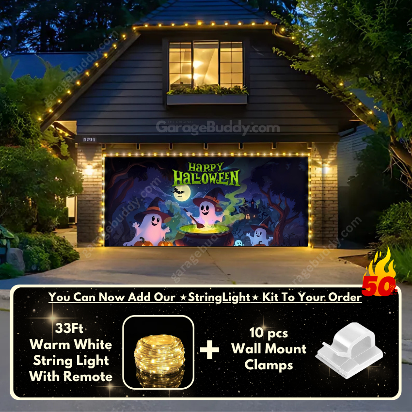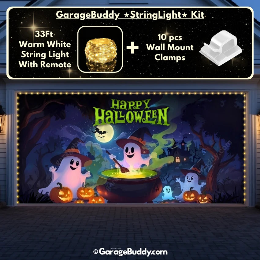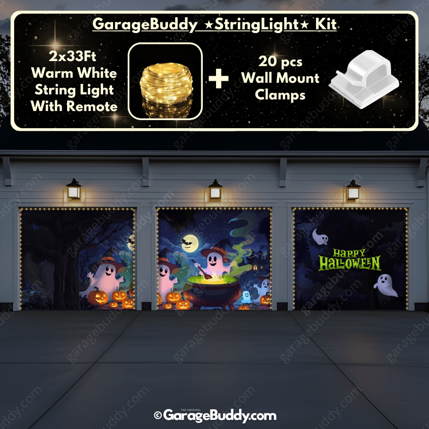 You now have the option to add the GarageBuddy string light kit to your order at 50% off and turn your spooky garage door cover into a true showstopper. The kit includes 1x 33 ft warm white string light, a remote control, and 10x sticky wall mount clamps. The 2-door garage option comes with 2 string light kits. The lights work on three AA batteries (not included), so you don't need to run around finding electrical outlets.