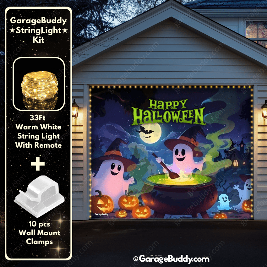 Every GarageBuddy now comes with a FREE upgraded installation kit that includes our new stitched-in flat elastic bands for the bottom corners and Velcro rolls for the top. Simply stick the top of the Halloween garage cover to your door using Velcro. Then, hook the elastic bands to the second hinge behind your garage door, and voilà! You're good to go faster than a witch on a broomstick!