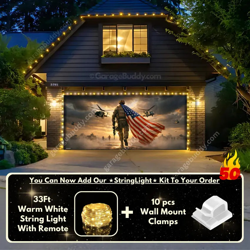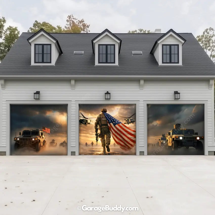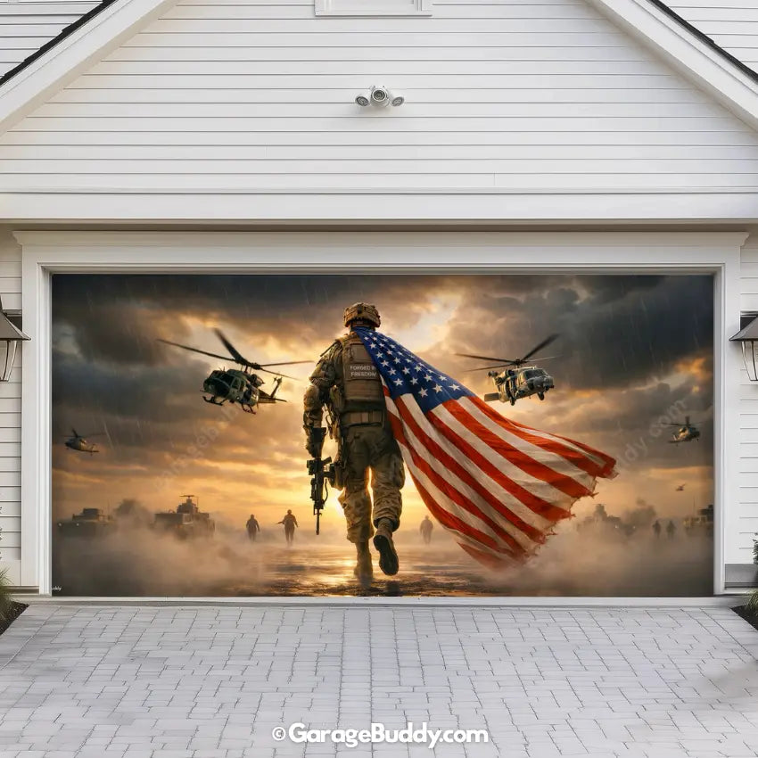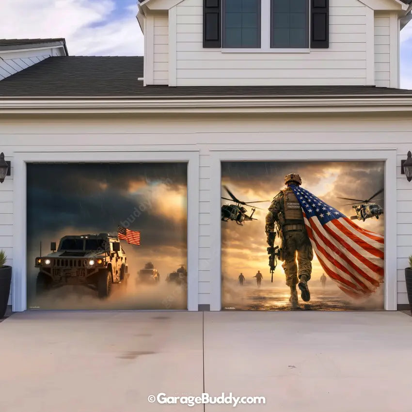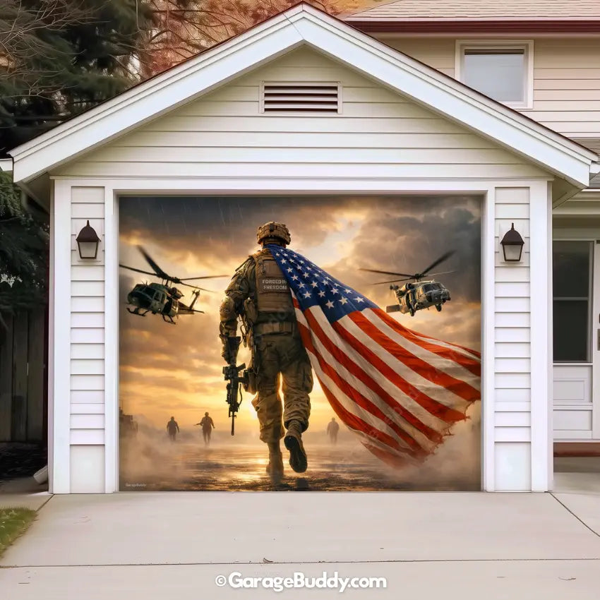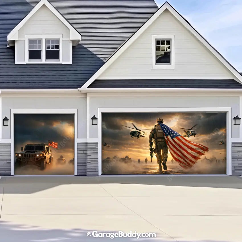 A patriotic soldier garage door cover with American flag design for powerful military decor. Ideal for 4th of July decorations, Memorial Day, Veterans Day, and patriotic home decor. Designed to showcase USA pride while honoring service, sacrifice, and freedom.