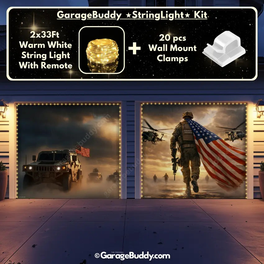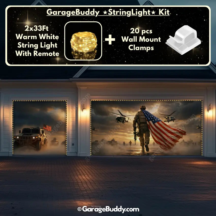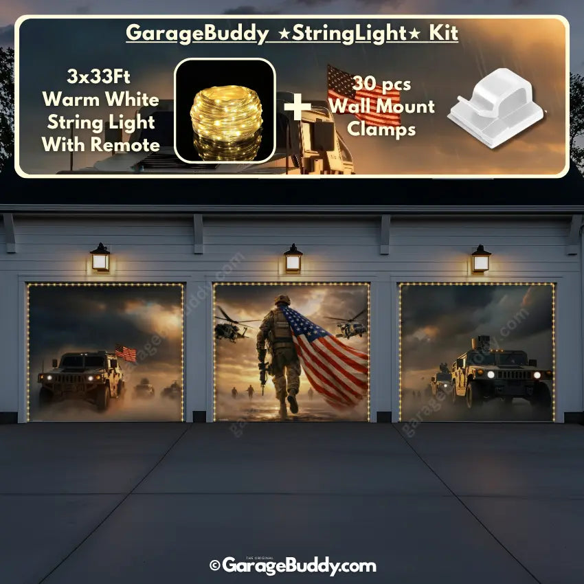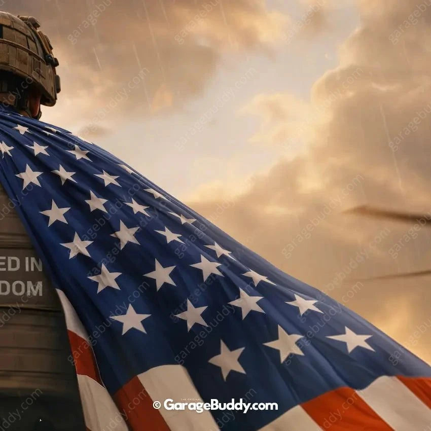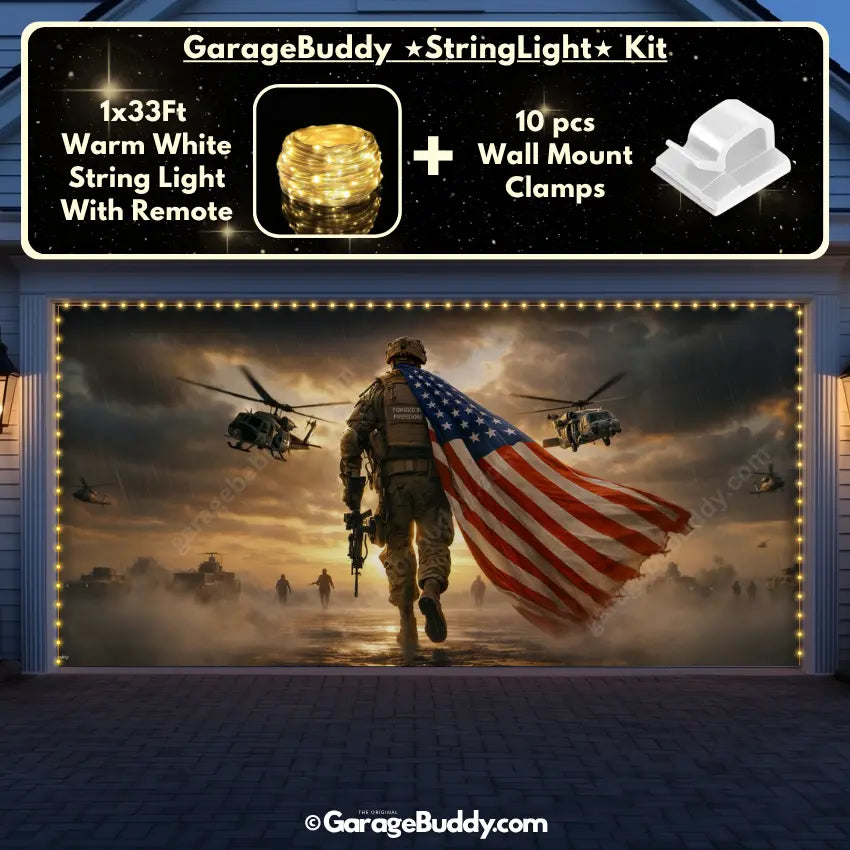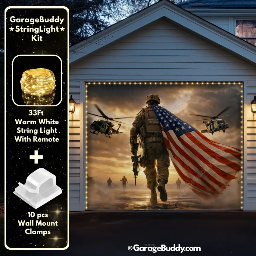 A patriotic soldier garage door cover with American flag design for powerful military decor. Ideal for 4th of July decorations, Memorial Day, Veterans Day, and patriotic home decor. Designed to showcase USA pride while honoring service, sacrifice, and freedom.