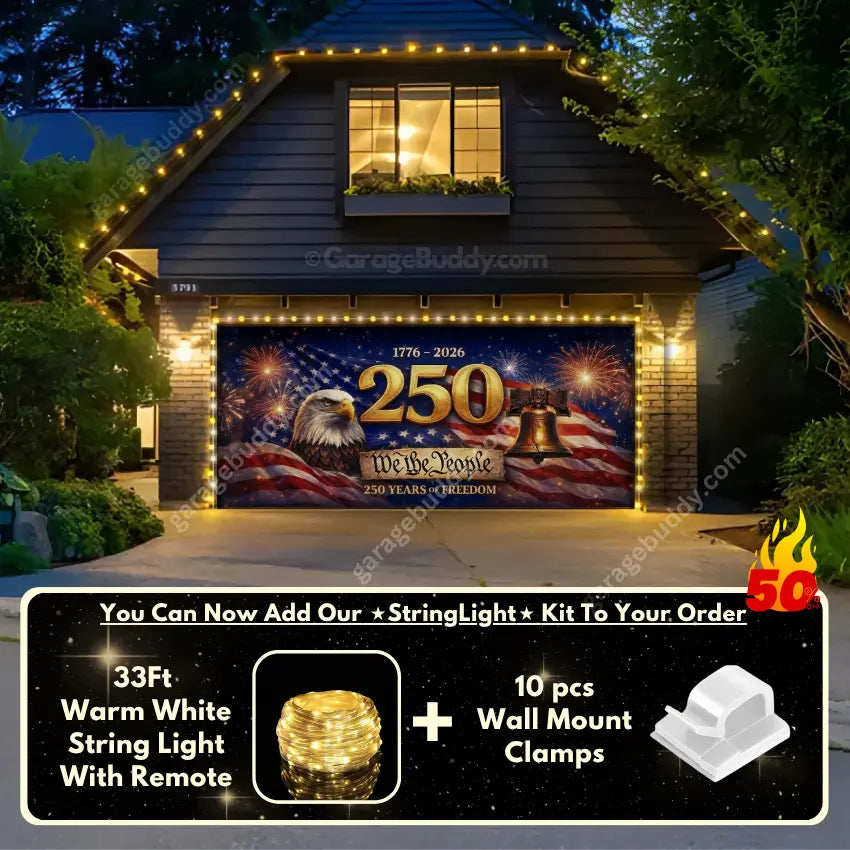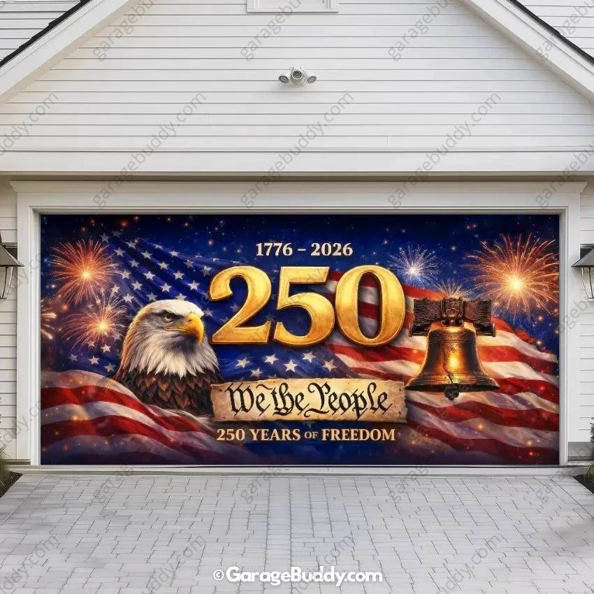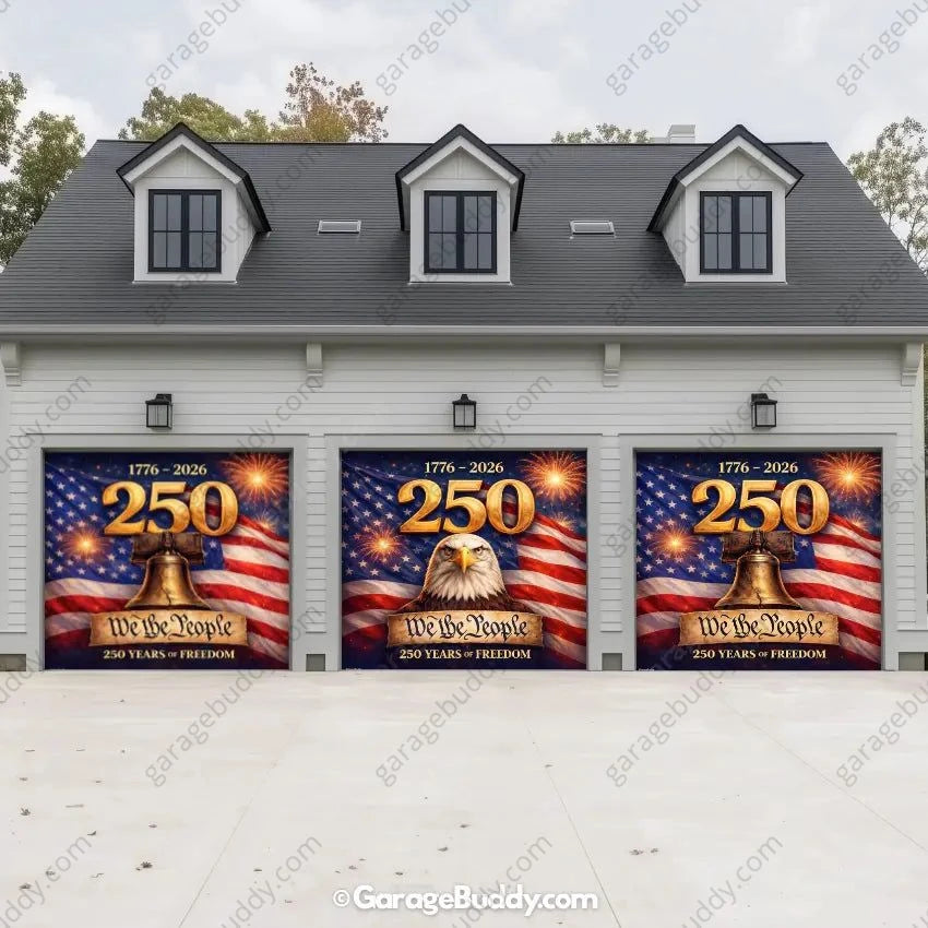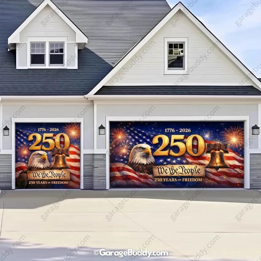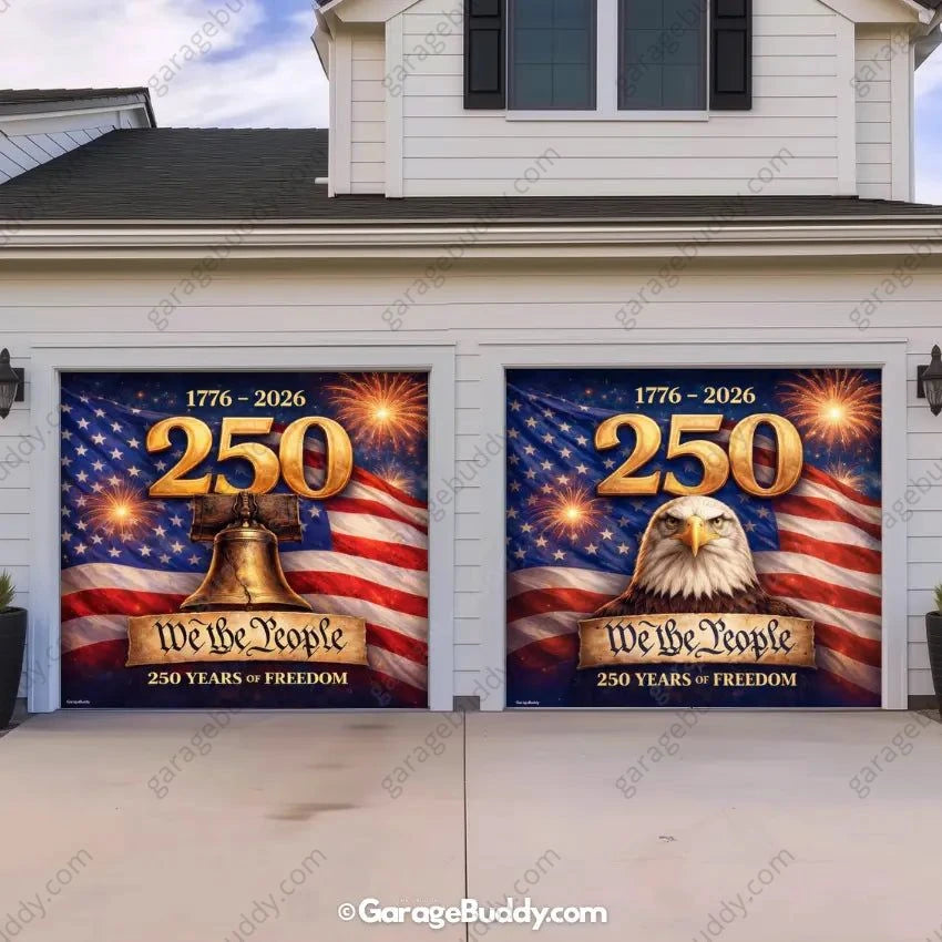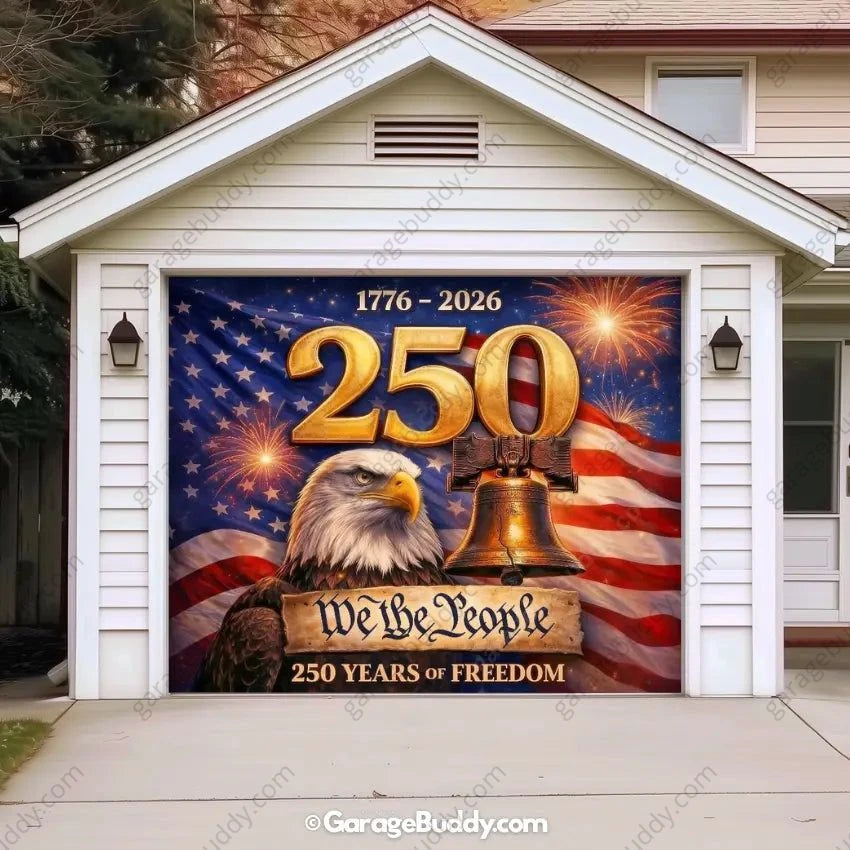 This Freedom 250 Limited Edition garage door cover features the American flag, eagle, and Liberty Bell design with “We The People” detail. Perfect for the USA's 250th anniversary, 4th of July decorations, Memorial Day, and patriotic home decor. A bold patriotic display that celebrates 250 years of American freedom, history, and pride.