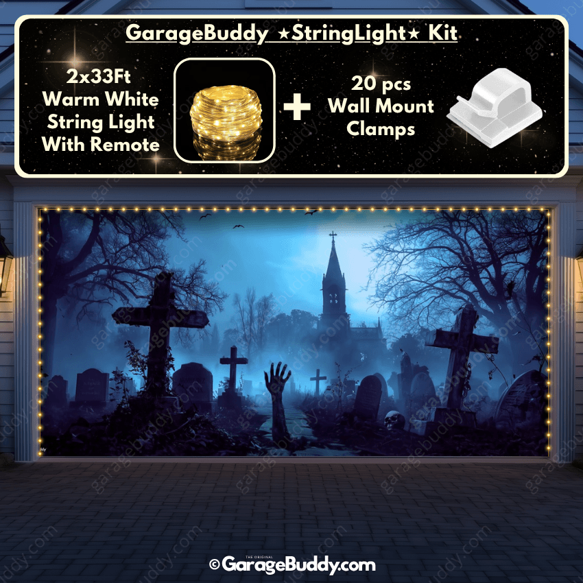 You now have the option to add the GarageBuddy string light kit to your order at 50% off and turn your garage into a true showstopper. The kit includes 1x 33 ft warm white string light, a remote control, and 10x sticky wall mount clamps. The 2-door garage option comes with 2 string light kits. The lights work on three AA batteries (not included), so you don't need to run around finding electrical outlets. Perfect for layering with your outdoor Halloween decorations for maximum effect.