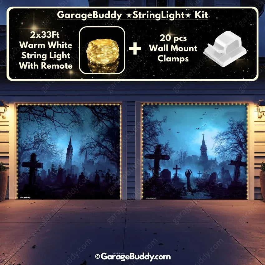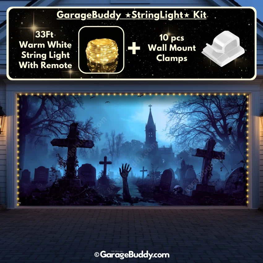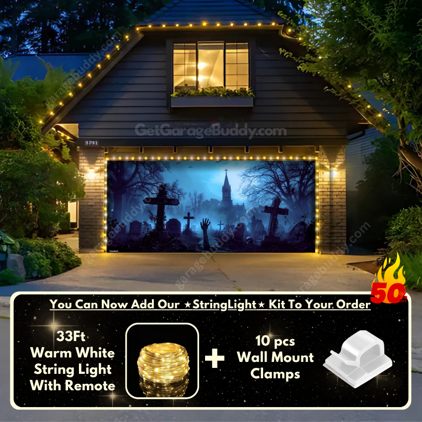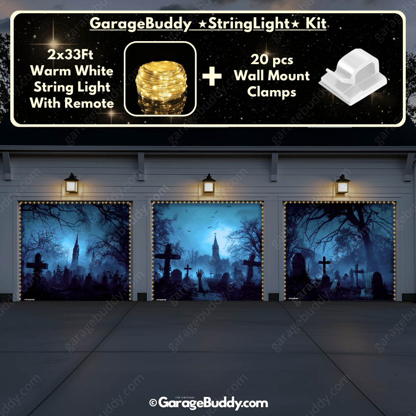 You now have the option to add the GarageBuddy string light kit to your order at 50% off and turn your garage into a true showstopper. Pair your Grave Rising Halloween Garage Door Cover with twinkling lights for maximum effect.