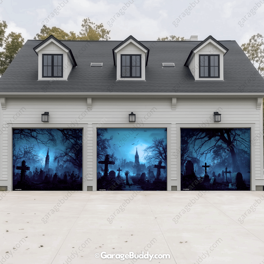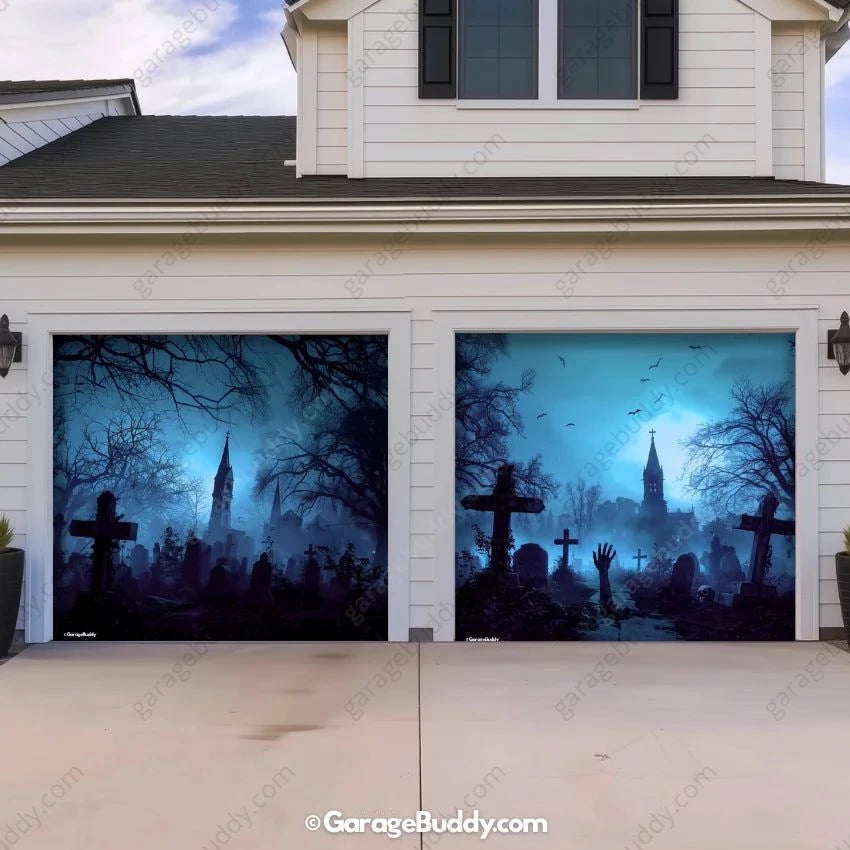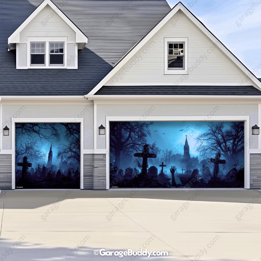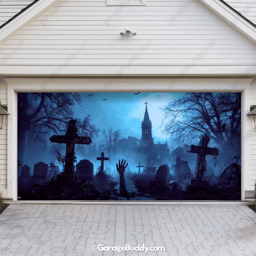 The grave can’t hold them forever! With a hand bursting through the earth under a moonlit sky, this Grave Rising Halloween garage door cover sets the scene for a night of fright you’ll never forget. One of the ultimate Halloween decoration ideas, it instantly transforms your home into a haunted attraction that neighbors won’t stop talking about.