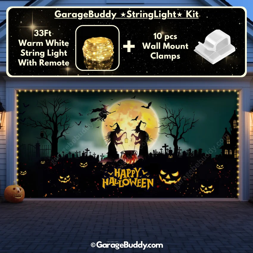 Level up your Halloween garage door cover with the GarageBuddy string lights kit. Available at 50% off, the kit includes 33 ft of warm white string lights, a remote control, and wall mount clamps. Paired with a creepy Halloween garage door cover, the glow turns your garage into a true haunted spectacle. Whether it’s a single- or double-door setup, the spooky garage door cover paired with lights guarantees a show-stopping effect.