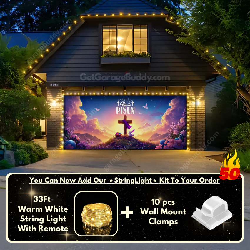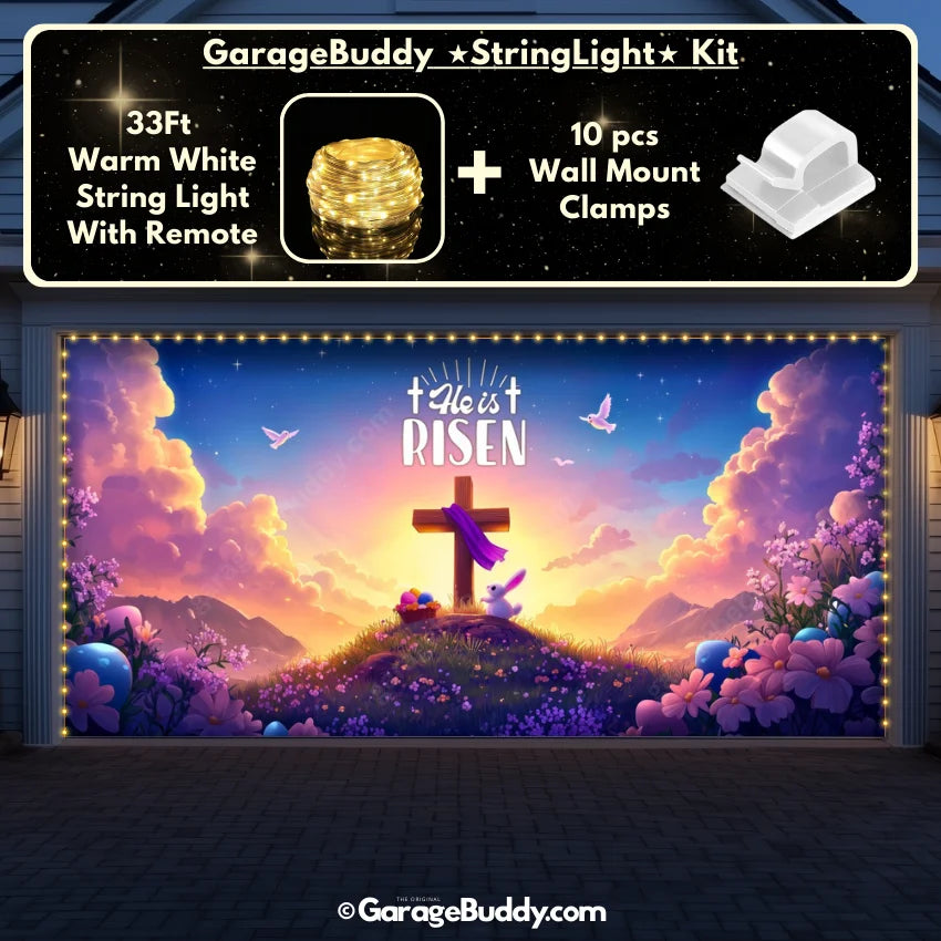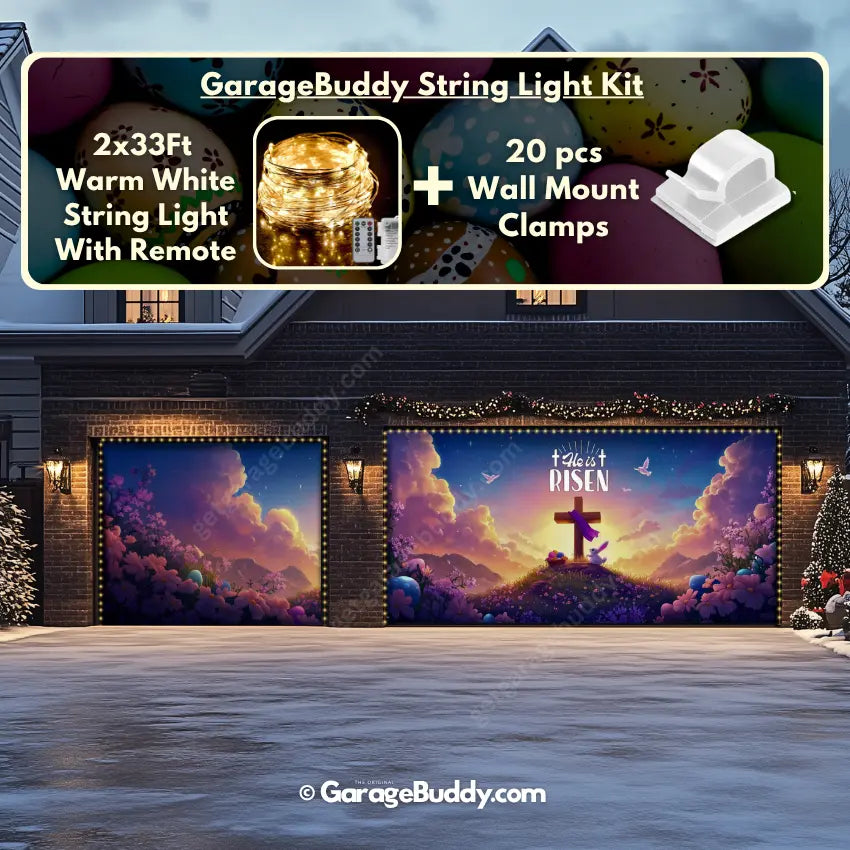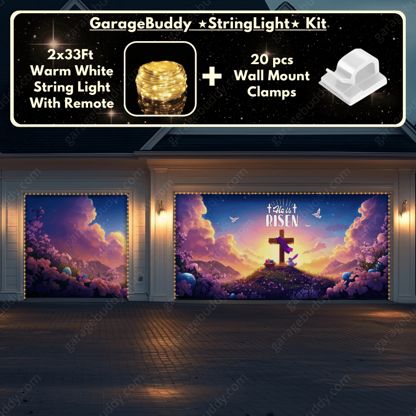 You now have the option to add the GarageBuddy string light kit to your order at 50% off and turn your Easter display into a glowing wonderland. The kit includes 1x 33 ft warm white string light, a remote control, and 10x sticky wall mount clamps. The 2-door garage option comes with 2 string light kits. The lights work on three AA batteries (not included), so you don't need to run around finding electrical outlets.
