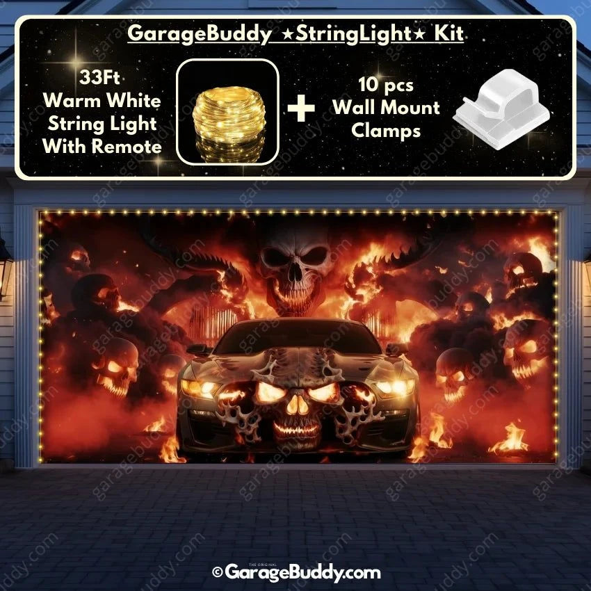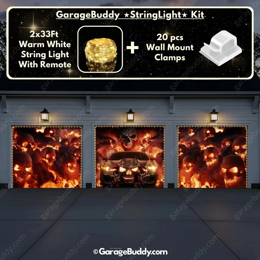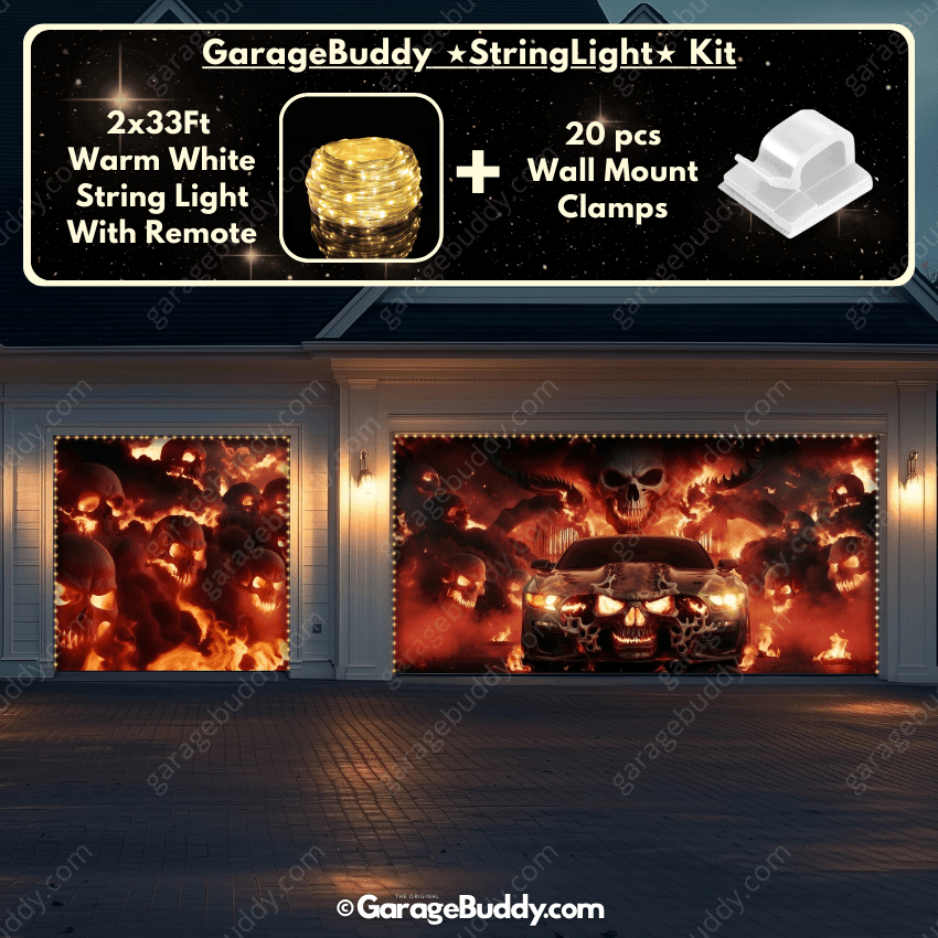 You now have the option to add the GarageBuddy string light kit to your order at 50% off and turn your garage into a true showstopper. The kit includes 1x 33 ft warm white string light, a remote control, and 10x sticky wall mount clamps. The 2-door garage option comes with 2 string light kits. The lights work on three AA batteries (not included), so you don't need to run around finding electrical outlets. Paired with a Spooky Garage Door Cover, it creates the ultimate haunted haven that brings your outdoor Halloween decorations to life.