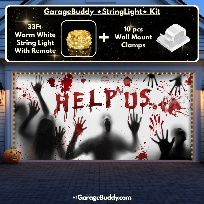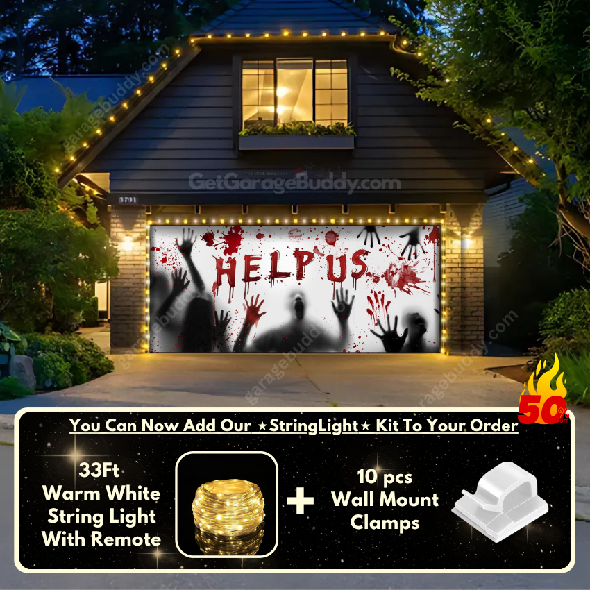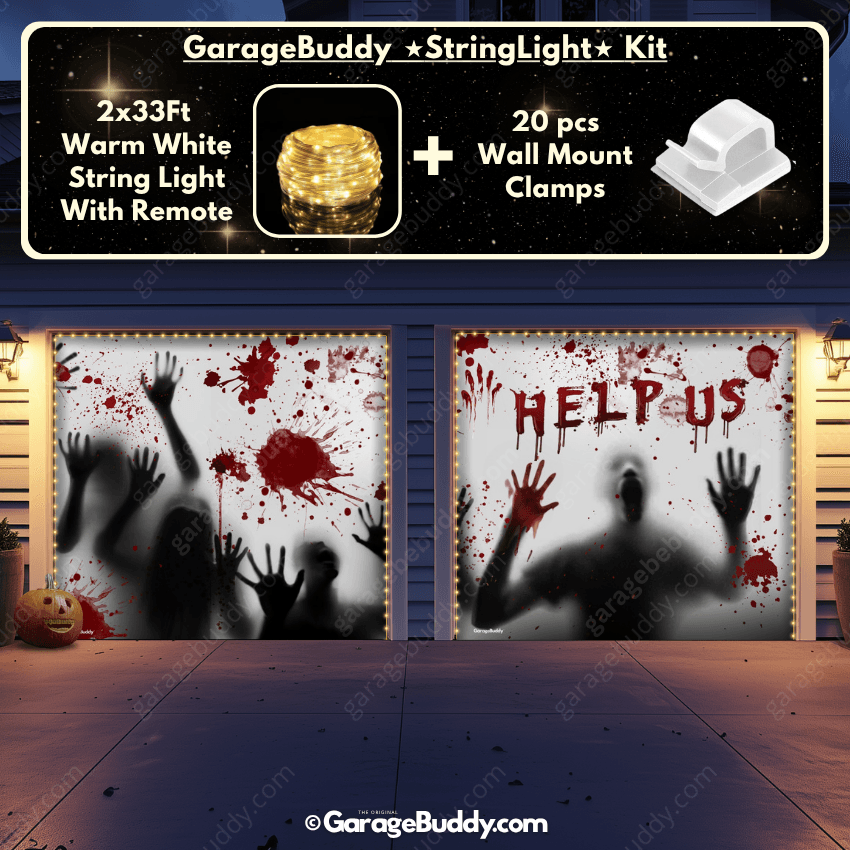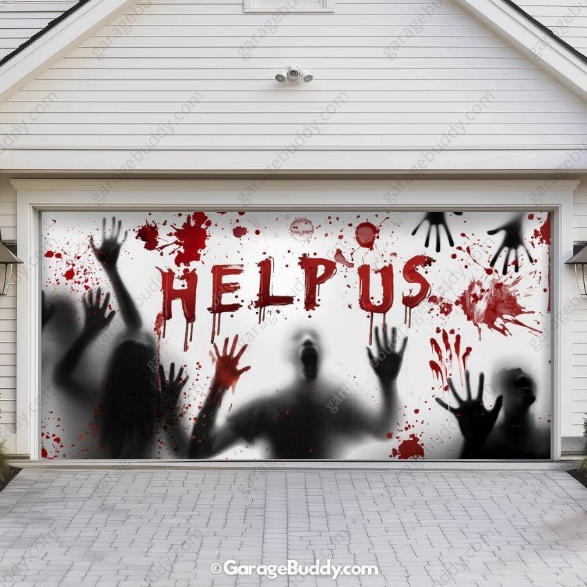 Create a chilling Halloween atmosphere with the Help Us! Halloween Garage Door Cover featuring terrifying shadows of trapped people. With eerie impressions of faces, hands, blood stains, and the haunting plea “Help Us” in blood red, this spooky garage door cover is designed to deliver spine-chilling fright right at your doorstep.