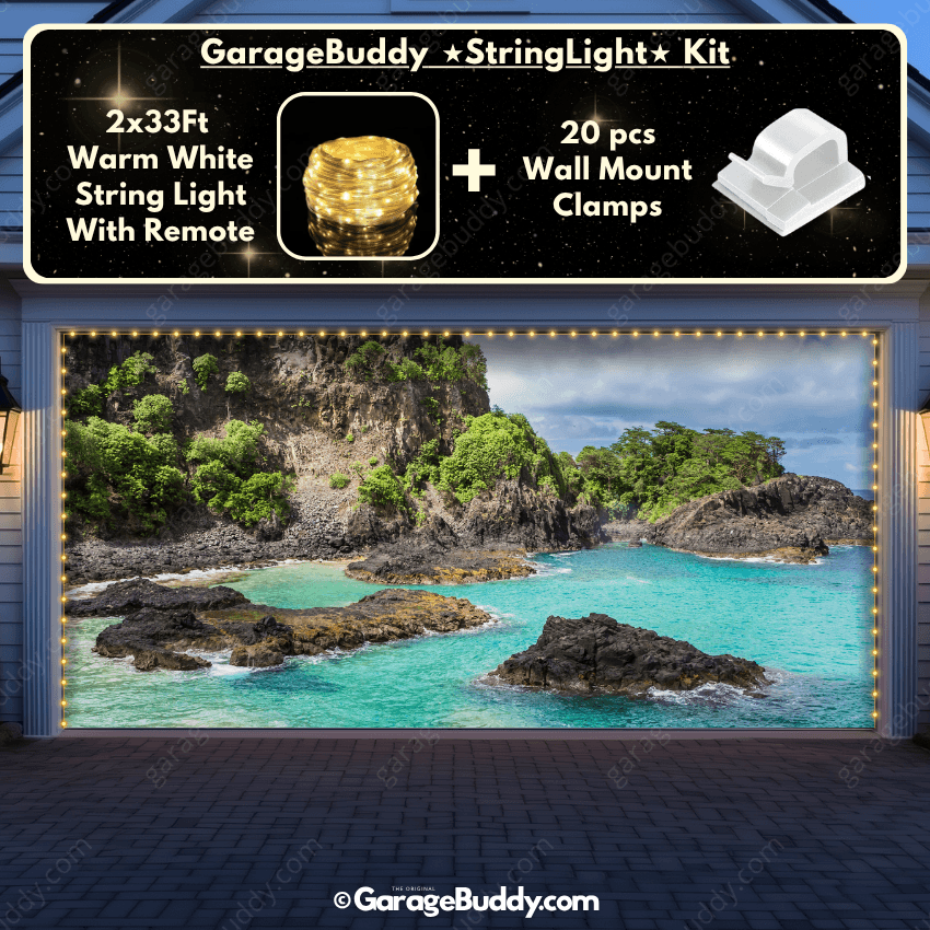 You now have the option to add the GarageBuddy string light kit to your order at 50% off and take your nature garage door cover display to the next level. The kit includes 1x 33ft warm white string light, a remote control and 10x sticky wall mount clamps. The 2-Door garage option comes with 2 string light kits. The lights work on three AA batteries (not included), so you don't need to run around finding electrical outlets.