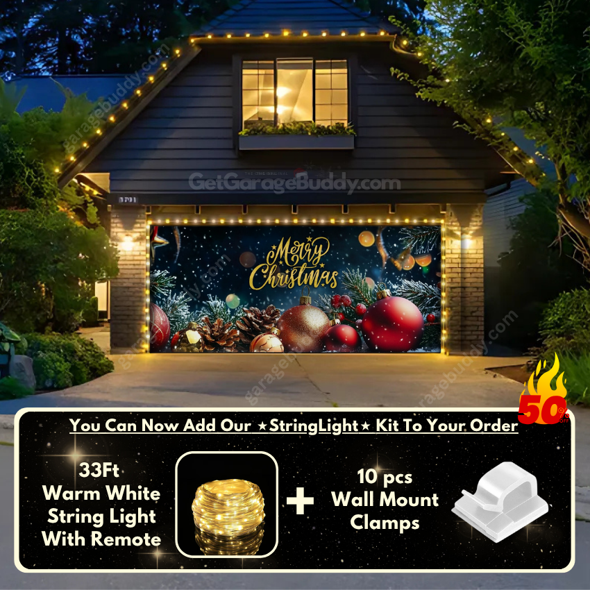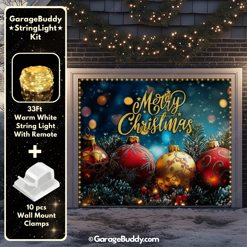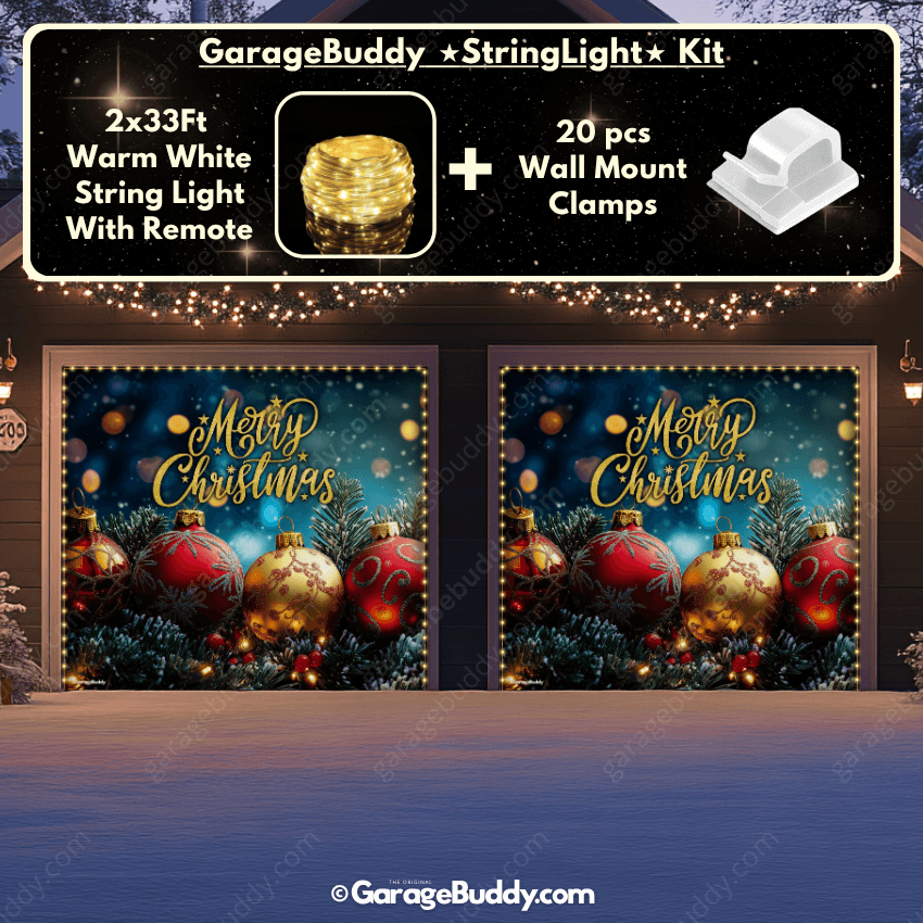 You now have the option to add the GarageBuddy string light kit to your order at 50% off and make your festive garage door cover sparkle even more. The kit includes 1x 33 ft warm white string light, a remote control, and 10 sticky wall-mount clamps. The 2-door garage option comes with 2 string light kits. Since the lights run on three AA batteries (not included), you don’t need to worry about extension cords or outlets.