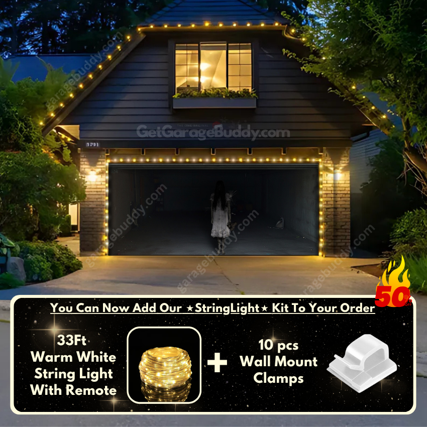 You now have the option to add the GarageBuddy string light kit to your order at 50% Off and turn your garage into a true showstopper. Pair it with a Spooky Garage Door Cover to create unforgettable outdoor Halloween decorations that will wow the entire neighborhood.