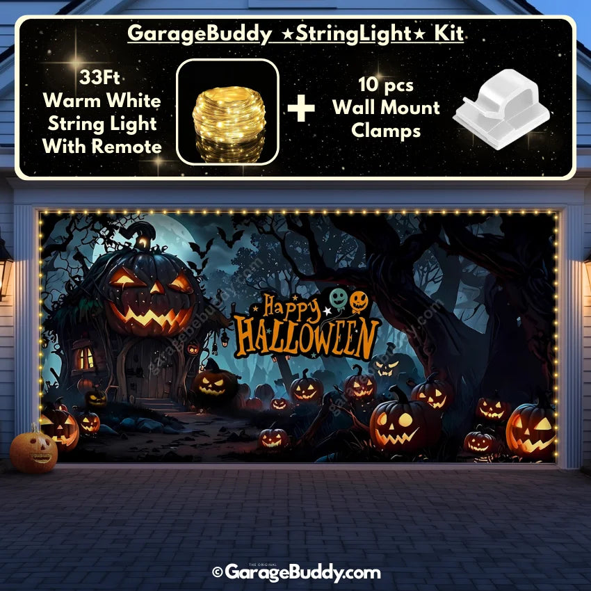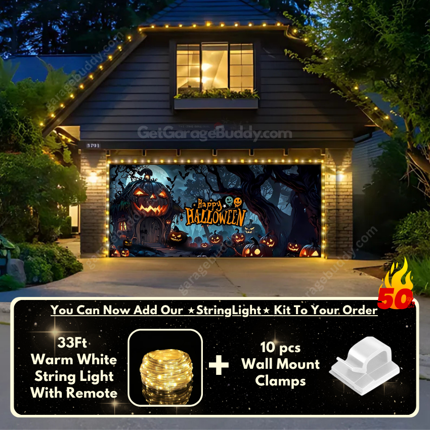 You now have the option to add the GarageBuddy string light kit to your order at 50% Off and turn your spooky garage door cover into a true showstopper. The kit includes 1x 33 ft warm white string light, a remote control, and 10x sticky wall mount clamps. The 2-door garage option comes with 2 string light kits. The lights work on three AA batteries (not included), so you don’t need to run around finding electrical outlets. Perfect for making your Halloween garage decoration ideas glow all night!