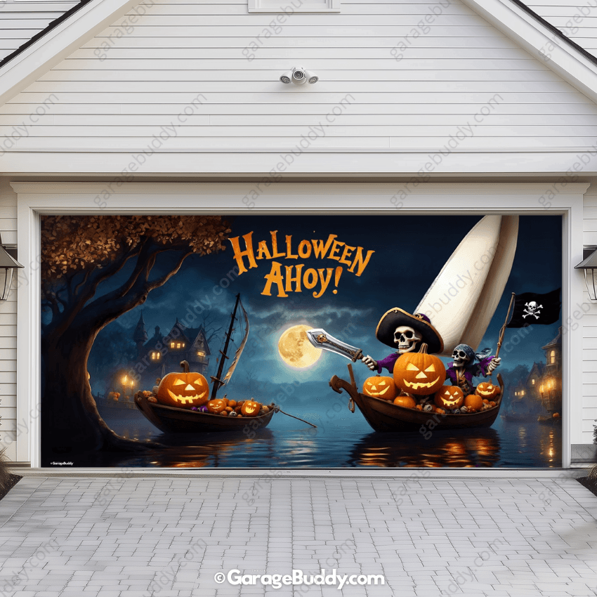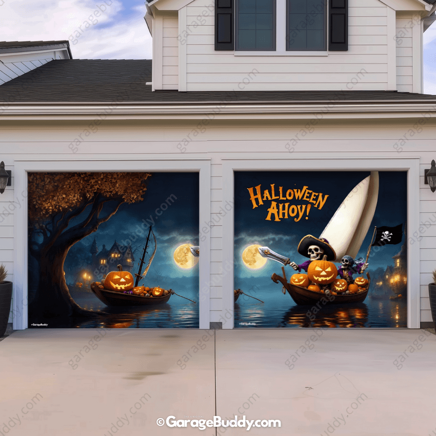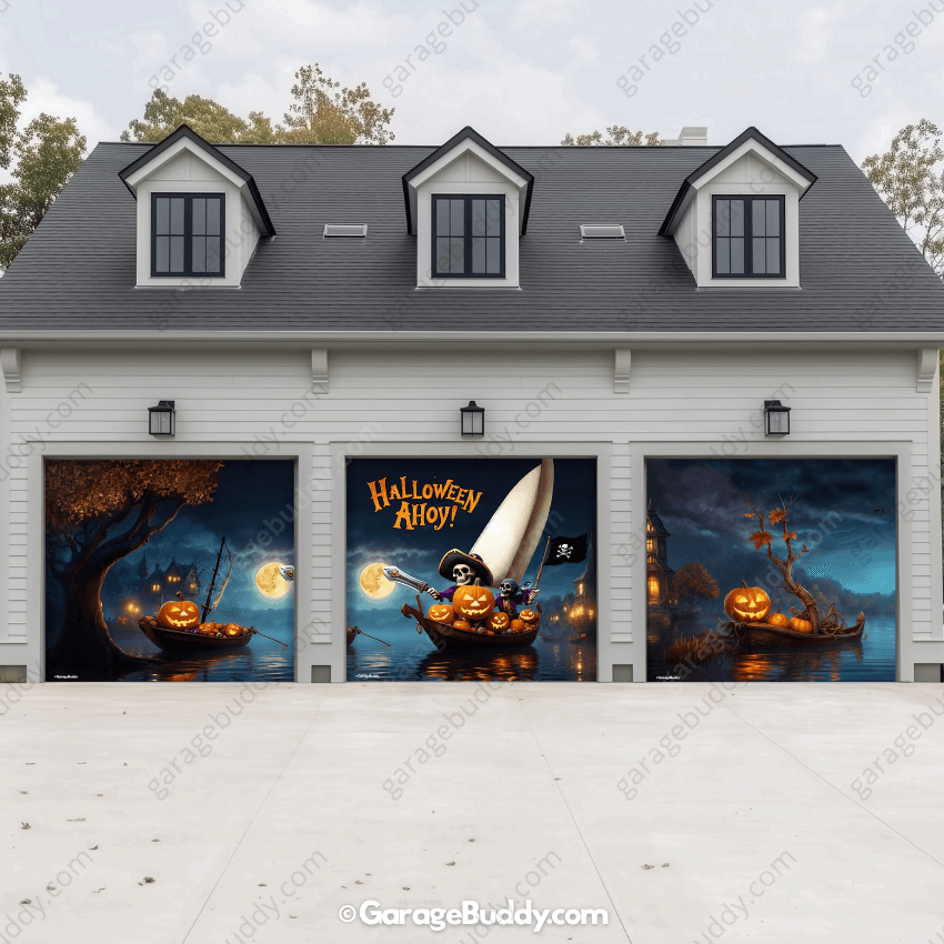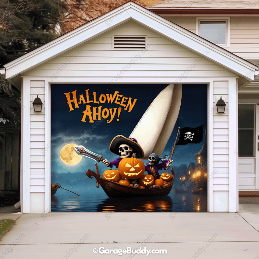 Climb aboard the creepiest ship on the seas! With pirate skeletons, glowing jack-o’-lanterns, and a full moon backdrop, the Pumpkin Pirates Halloween Garage Door Cover brings a haunted adventure right to your doorstep. Perfect for anyone searching for bold Halloween garage decoration ideas, this design instantly transforms your house into a spooky landmark that neighbors won’t forget.