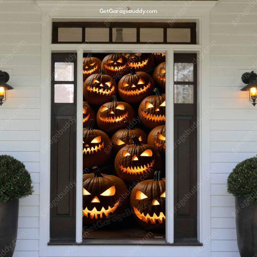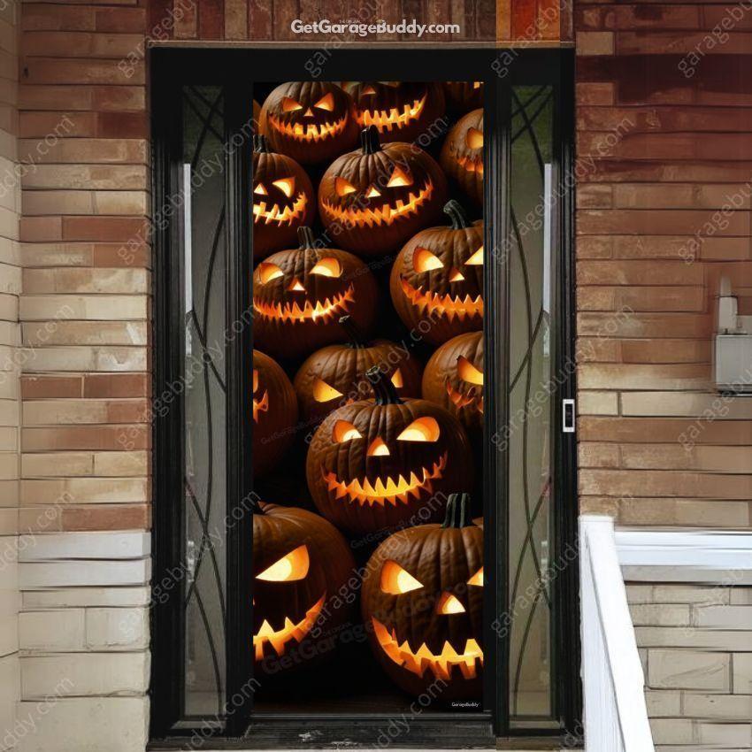 This Halloween, let the pumpkins do the scaring! The Scary Pumpkins Halloween Front Door Cover is the ultimate way to level up your front door Halloween decorations and give trick-or-treaters a fright they won’t forget. With eerie glowing pumpkin faces staring back, your porch instantly transforms into a haunted entryway that sets the perfect spooky mood.