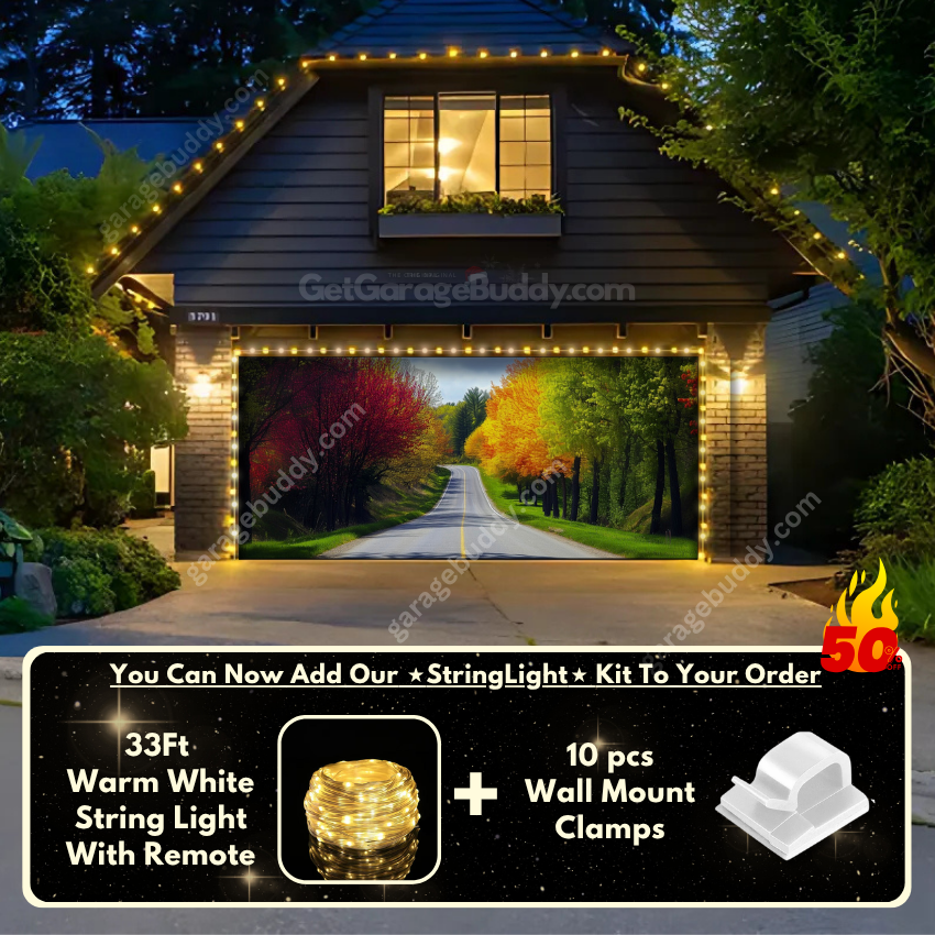 By request, we now offer the GarageBuddy string light kit at 50% off. While perfect for year-round use, it pairs beautifully with your Nature Garage Door Banner to add a gentle spring glow. The kit includes 1x 33ft warm white string light, a remote control, and 10x sticky wall mount clamps. The 2-door garage option comes with 2 string light kits. The lights work on three AA batteries (not included), so you don't need to run around finding electrical outlets.