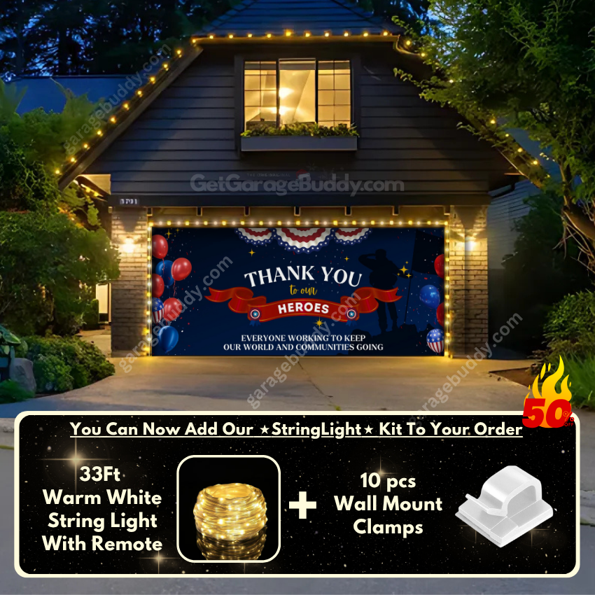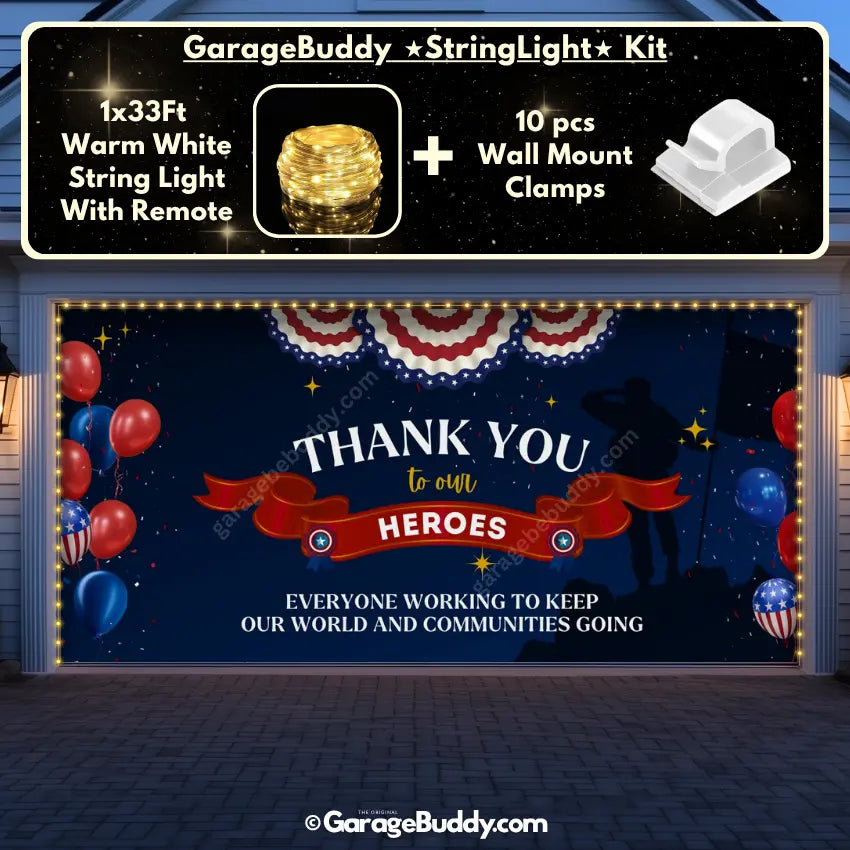 You now have an option to add the GarageBuddy string light kit to your order at 50% off and turn your garage into a true winter wonderland. Pair your patriotic garage door banner with glowing outdoor holiday decorations to make your display unforgettable. The kit includes 1x 33 ft warm white string light, a remote control, and 10x sticky wall mount clamps. The 2-door garage option comes with 2 string light kits. The lights work on three AA batteries (not included), so you don't need to run around finding electrical outlets.