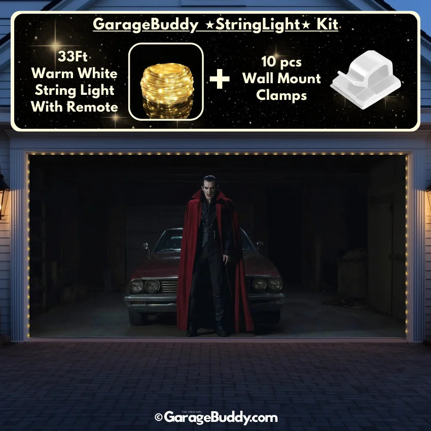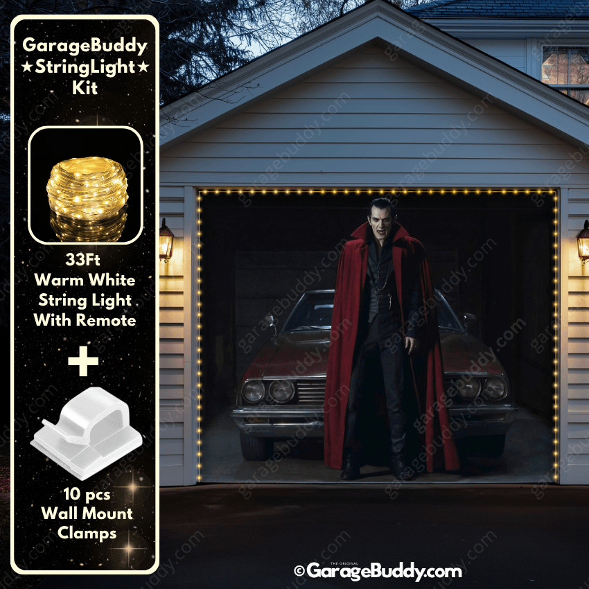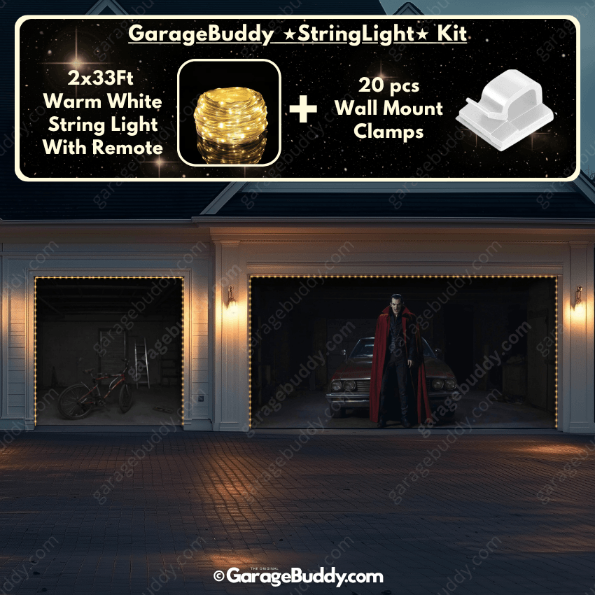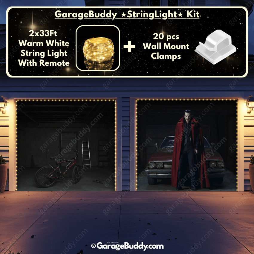 You now have the option to add the GarageBuddy string light kit to your order at 50% off and make the BloodSucker even more terrifying after dark. Pair your Halloween garage door cover with glowing string lights to amplify the eerie effect. The kit includes 1x 33 ft warm white string light, a remote control, and 10x sticky wall mount clamps. The 2-door garage option comes with 2 kits. The lights run on three AA batteries (not included), so you don’t need to scramble for outlets—making it the perfect upgrade for your creepy garage door cover.