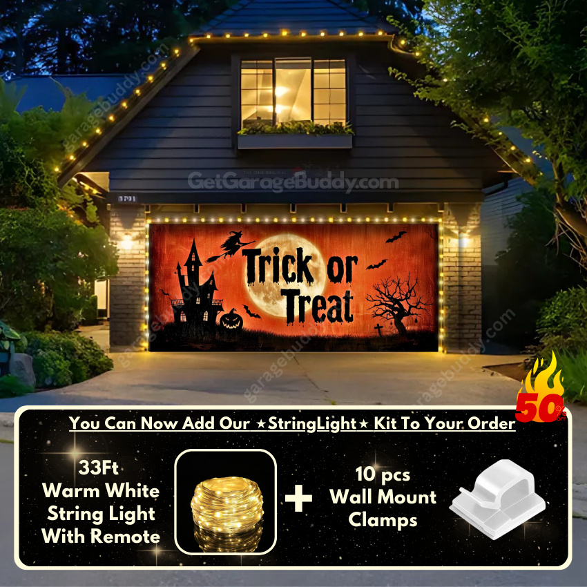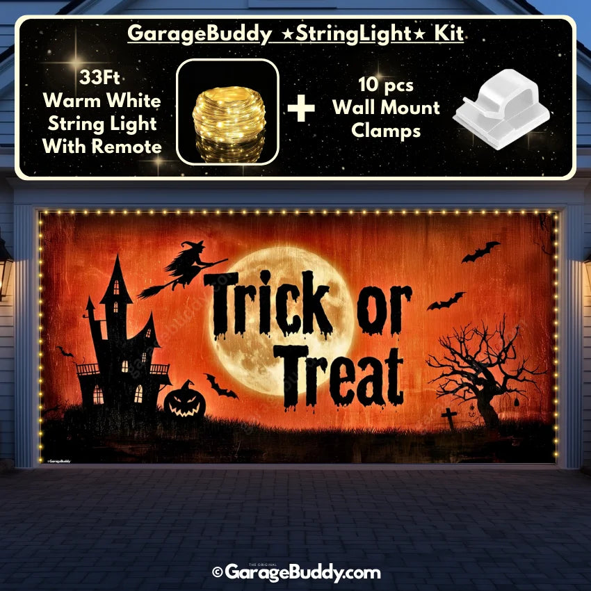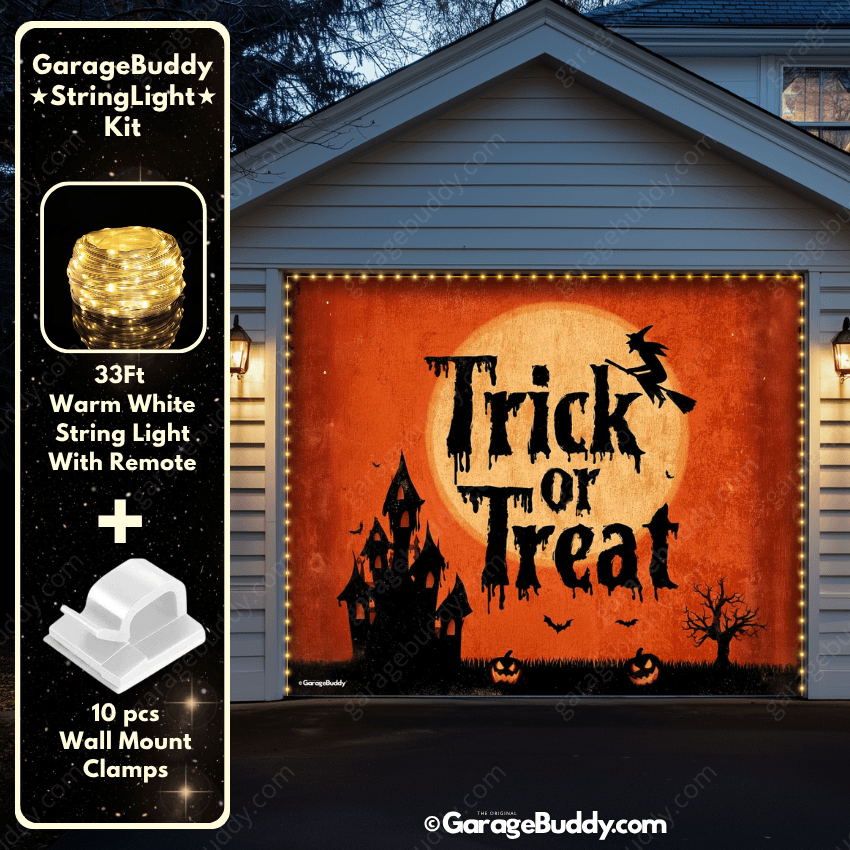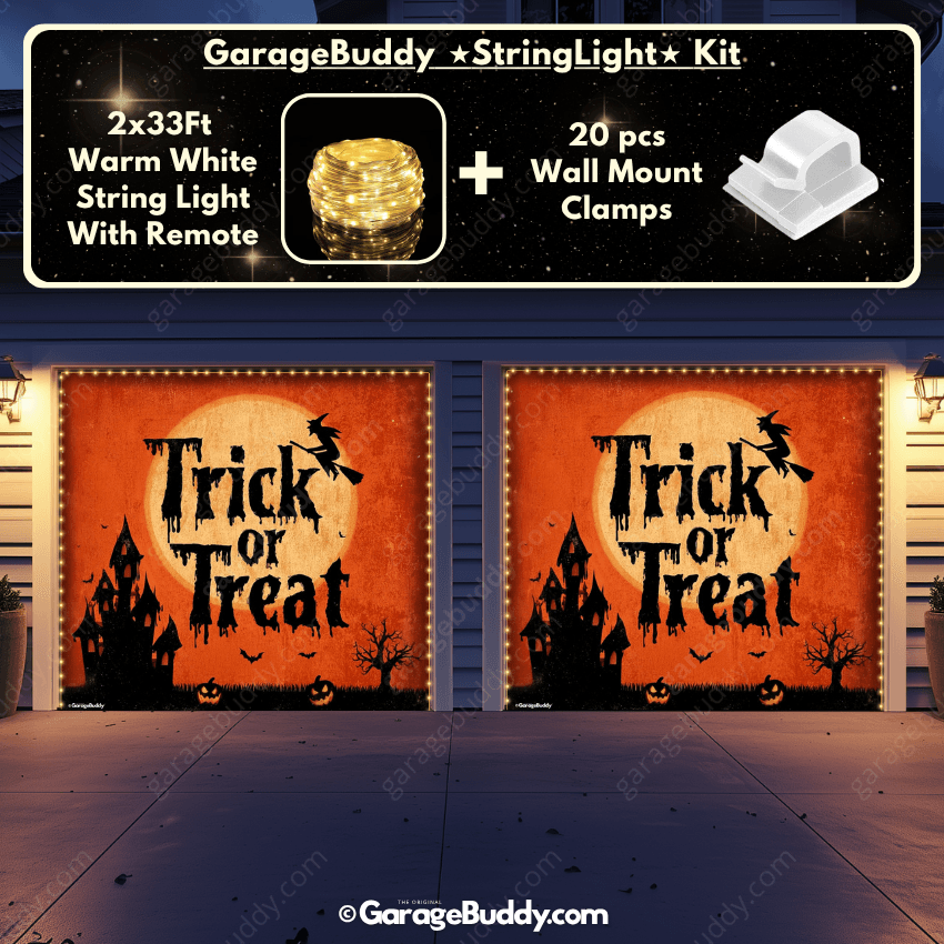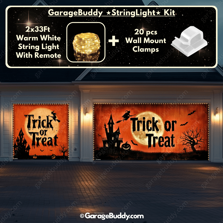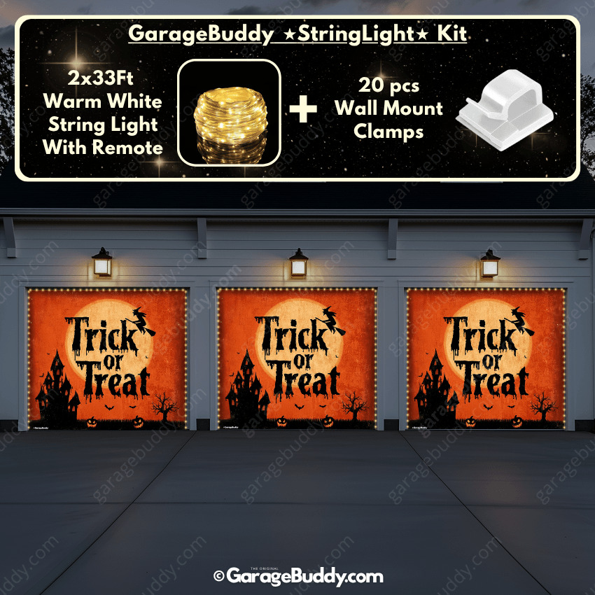 You now have the option to add the GarageBuddy string light kit to your order at 50% Off and turn your creepy garage door cover into a true showstopper. The kit includes 1x 33 ft warm white string light, a remote control, and 10x sticky wall mount clamps. The 2-door garage option comes with 2 string light kits. Pair it with a Halloween garage door cover for a glow that takes spooky season to the next level.