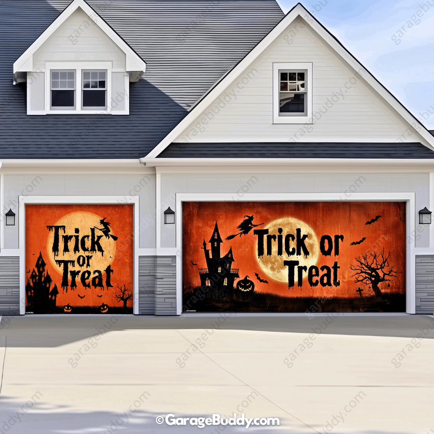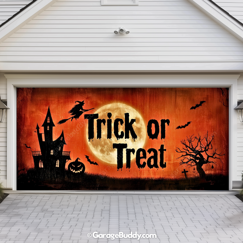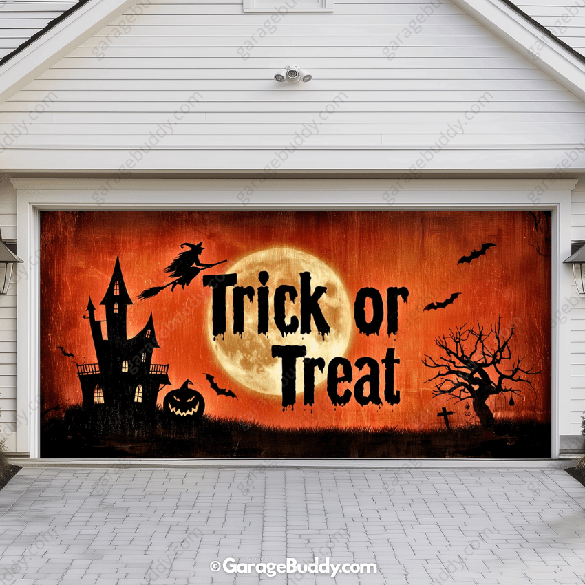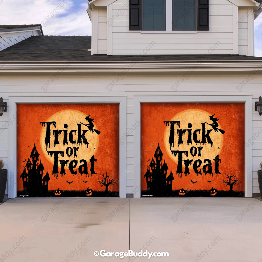 Whether you’re handing out candy or haunting the block, this eerie Trick or Treat Halloween Garage Door Cover sets the tone for spooky season. With its shadowy castle, flying witch, and vintage Halloween vibes, it tells every visitor that Halloween has officially arrived.