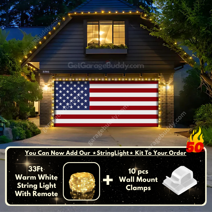 You now have the option to add the GarageBuddy string light kit to your order at 50% off and turn your garage into a true celebration hotspot. Pair it with your patriotic garage door cover and watch your home shine bright this Independence Day. The kit includes 1x 33 ft warm white string light, a remote control, and 10x sticky wall mount clamps. The 2-door garage option comes with 2 string light kits. The lights work on three AA batteries (not included), so you don't need to run around finding electrical outlets.