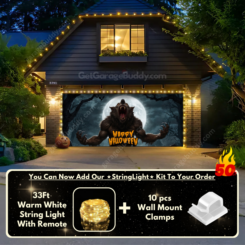 You can now add the GarageBuddy string light kit to your order at 50% off and turn your haunted display into a true showstopper. The kit includes 1x 33 ft warm white string light, a remote control, and 10x sticky wall mount clamps. The 2-door garage option comes with 2 string light kits. The lights work on three AA batteries (not included), so you don’t need to run around finding electrical outlets. Combine them with your creepy garage door cover for the ultimate haunted house vibe.